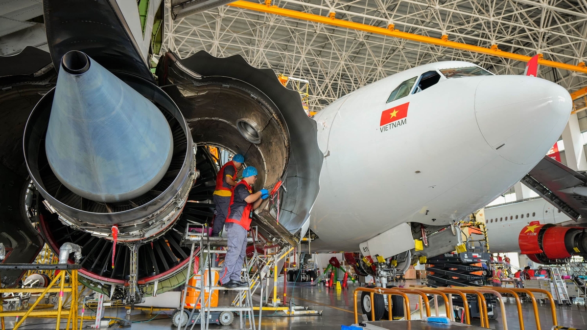 Technicians conduct inspections on an aircraft at the one-stop aircraft maintenance base in Haikou on Sept 23. PROVIDED TO CHINA DAILY